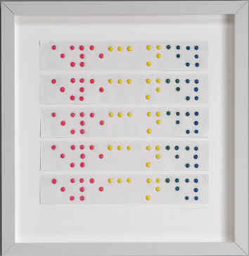 | Sally Curcio, Eye Candy, 2005, Button candy on paper that spells out "eyecandy" in Braille, 17" x 16 1/2" (Note that the candy is mounted under glass so that the braille can't be read) |